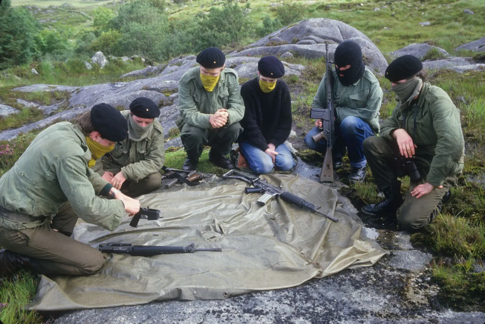 ЧЛЕНЫ ИРЛАНДСКОЙ РЕСПУБЛИКАНСКОЙ АРМИИ ПРОХОДЯТ ОБУЧЕНИЕ В ТАЙНОМ МЕСТЕ В СЕЛЬСКОЙ МЕСТНОСТИ ЗА ПРЕДЕЛАМИ ГОРОДА ДОНЕГАЛА В ИРЛАНДСКОЙ РЕСПУБЛИКЕ 21 АВГУСТА 1986 Г. СРЕДИ ДОБРОВОЛЬЦЕВ МОЛОДАЯ ЖЕНЩИНА (В ЦЕНТРЕ, В ЧЕРНОМ СВИТЕРЕ)