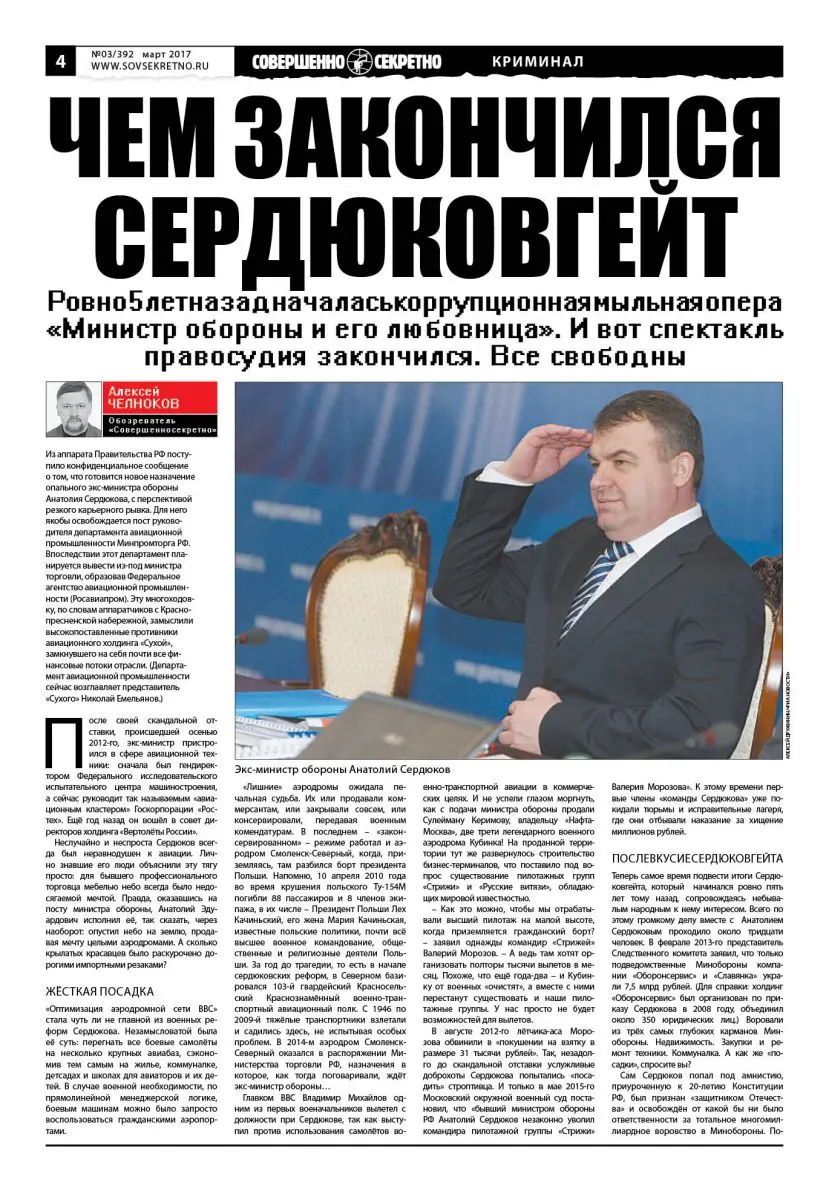 Из аппарата Правительства РФ поступило конфиденциальное сообщение о том, что готовится новое назначение опального экс-министра обороны Анатолия Сердюкова, с перспективой резкого карьерного рывка. Для него якобы освобождается пост руководителя департамента авиационной промышленности Минпромторга РФ. Впоследствии этот департамент планируется вывести из-под министра торговли, образовав Федеральное агентство авиационной промышленности (Росавиапром). Эту многоходовку, по словам аппаратчиков с Краснопресненской набережной, замыслили высокопоставленные противники авиационного холдинга «Сухой», замкнувшего на себя почти все финансовые потоки отрасли. (Департамент авиационной промышленности сейчас возглавляет представитель «Сухого» Николай Емельянов.)