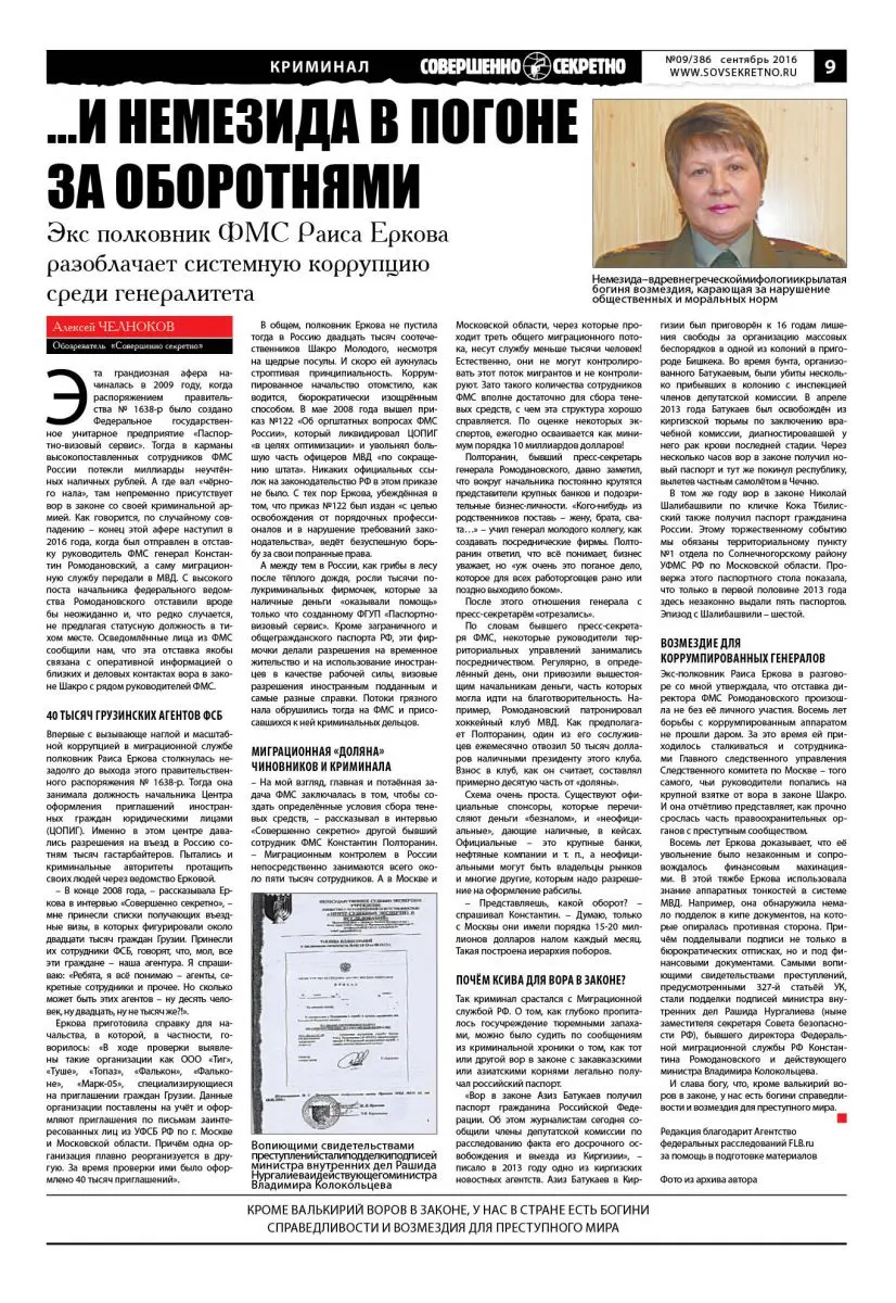Экс-полковник Раиса Еркова в разговоре со мной утверждала, что отставка директора ФМС Ромодановского произошла не без её личного участия. Восемь лет борьбы с коррумпированным аппаратом не прошли даром. За это время ей приходилось сталкиваться и сотрудниками Главного следственного управления Следственного комитета по Москве – того самого, чьи руководители попались на крупной взятке от вора в законе Шакро. И она отчётливо представляет, как прочно срослась часть правоохранительных органов с преступным сообществом.