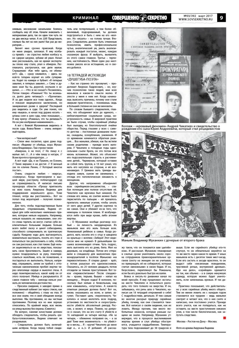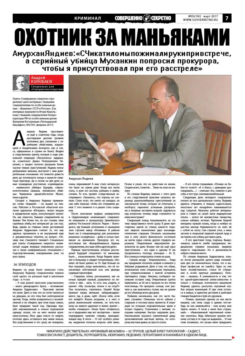 Сегодня к Амурхану Яндиеву применимо слово «бывший» – он вышел на пенсию. Работает в Ростовской областной коллегии адвокатов «Югправо», читает лекции в юридических вузах, консультирует коллег. Но, как известно, бывших следователей не бывает. Тем более что, по его словам, тема серийных убийц его интересует до сих пор. Ведь одним из главных своих достижений Амурхан Хадрисович считает то, что ему удалось проникнуть в их внутренний мир и документально ответить на вопрос: «Почему они становятся такими?» Специально для газеты «Совершенно секретно» знаменитый сыщик впервые откровенно рассказал о своих «неформальных» отношениях с подследственными, наводившими ужас на всю страну.