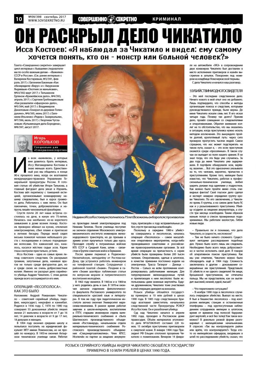 Исса Костоев – одна из самых ярких легенд советского следствия. Он раскрывал громкие, запутанные дела, наживая врагов не только среди фигурантов дел, но и среди своих не очень добросовестных коллег. Именно он раскрыл дело серийного убийцы Андрея Чикатило. С этим делом прежде всего ассоциируется его имя.