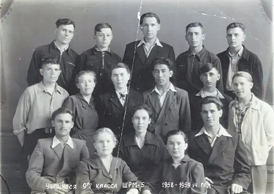 Целиноград. Школа рабочей молодёжи. Днём Исса работал учеником автослесаря, вечером – учился. Костоев – в верхнем ряду второй справа