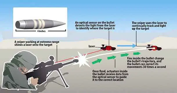 Обыкновенная пуля при вылете из ствола винтовки начинает раскачиваться, здесь используется система стабилизации; «оперение» делает умный боеприпас более устойчивым. С помощью получаемой от систем наведения информации, пуля при помощи аэродинамических элементов корректирует параметры полета, обеспечивая уверенное поражение цели. Таким образом, пуля превратилась в управляемый снаряд.