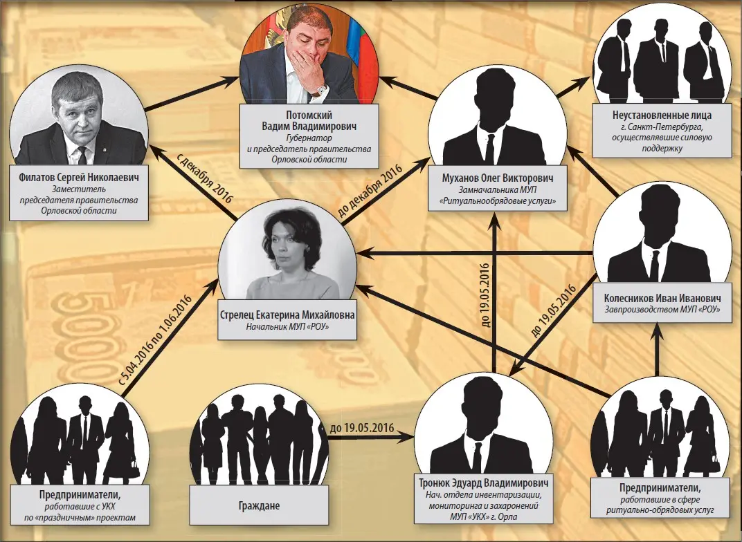 5 апреля была задержана «королева кладбищ» Екатерина Стрелец – начальник Муниципального унитарного предприятия «Ритуально-обрядовые услуги» города Орла. Она признала вину в получении взятки в крупном размере, согласилась сотрудничать со следствием и дала показания, в которых раскрыла схему движения денег внутри преступной группы. Конечными бенефициарами, если верить имеющемуся в распоряжении редакции протоколу допроса Стрелец, были Вадим Потомский, его заместитель Сергей Филатов и неустановленные представители силовых структур Санкт-Петербурга. 14 страниц показаний Стрелец оказались своего рода бомбой, которая вызвала бурную реакцию лиц, приближённых к губернатору, прокуроров и адвокатов, сотрудников силовых структур и журналистов, а также жителей Орловской области. Две недели, прошедшие с момента публикации, потребовали «дополнений и уточнений»…