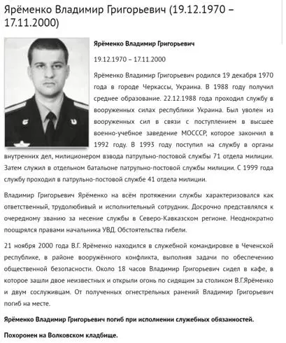 А в следующей командировке в Чечне двое неизвестных убили старшину МВД Владимира Яременко и двух его коллег. В книге памяти на сайте МВД написано: