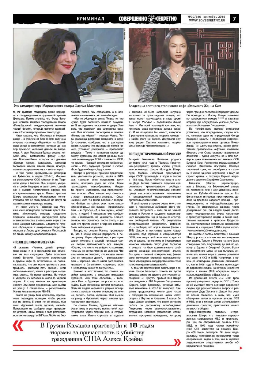 «Именно Мисикова обратилась к своему знакомому Калашову (Шакро Молодому) с просьбой помочь «отжать» деньги у Жанны Ким. 14 декабря прошлого года Калашов отправил для «разговора» в ресторан группу своих подручных и чем это закончилось – известно: двое помощников Шакро были убиты, один ранен», – сказал источник. Он отметил, что, скрываясь, Мисикова инсценировала своё убийство – на одной из улиц Центрального округа Москвы было обнаружено обгоревшее тело женщины, которую родственники опознали как Мисикову. «Однако позже выяснилось, что идентификация была подложной – погибшей оказалась женщина без определённого места жительства, а Мисикова жива-здорова и скрывается во Франции», – сказал собеседник агентства. Агентство федеральных расследований FLB.ru провело собственное расследование, чтобы составить более подробное описание обеих дам.