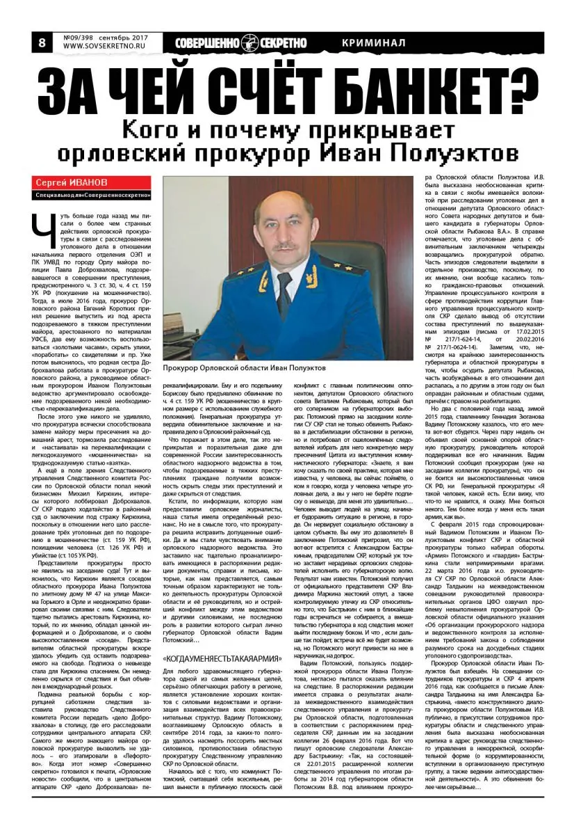 Кстати, по информации, которую нам предоставили орловские журналисты, наша статья имела определённый резонанс. Но не в смысле того, что прокуратура решила исправить допущенные ошибки. Да и мы стали чувствовать внимание орловского надзорного ведомства. Это заставило нас тщательно проанализировать имеющиеся в распоряжении редакции документы, справки и письма, которые, как нам представляется, самым точным образом характеризуют не только деятельность прокуратуры Орловской области и её руководителя, но и острейший конфликт между этим ведомством и другими силовиками, не последнюю роль в развитии которого сыграл лично губернатор Орловской области Вадим Потомский…