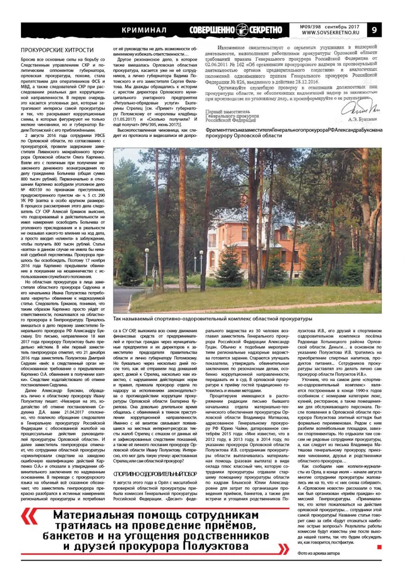 Процитируем имеющееся в распоряжении редакции письмо бывшего начальника отдела материально-технического обеспечения прокуратуры Орловской области Владимира Матяшова, адресованное Генеральному прокурору РФ Юрию Чайке, датированное сентябрём 2015 года: «Мне известно, что в 2012 году, в 2013 году, в 2014 году, по указанию прокурора Орловской области Полуэктова И.В. сотрудникам прокуратуры области выплачивалась материальная помощь (разовая выплата) в виде оклада плюс классный чин, которую сотрудники прокуратуры отдавали старшему помощнику прокуратуры области по кадрам Блынской Юлии Александровне для затрат по организации проведения приёмов, банкетов, а также для встречи и угощения родственников Полуэктова И.В., его друзей в спортивном оздоровительном комплексе посёлка Радовище Хотынецкого района Орловской области. Деньги… в основном по указанию Полуэктова И.В. тратились на приобретение спиртных напитков, продуктов питания… Сотрудников прокуратуры заставлял это делать лично сам прокурор области Полуэктов И.В.».