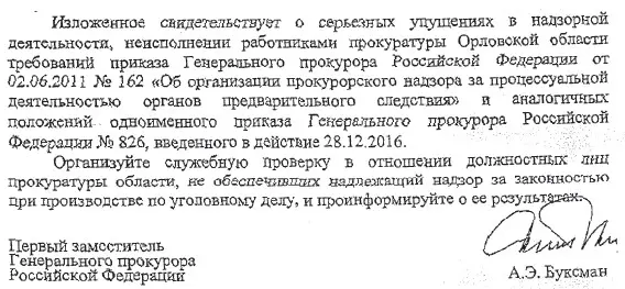 Далее Александр Буксман, обращаясь лично к областному прокурору Ивану Полуэктову пишет: «Невзирая на это, ходатайство об отмене постановления Седухина Д.А. вами 21.04.2017 отклонено, что повлекло обращение следователя в Генеральную прокуратуру Российской Федерации с обоснованной жалобой на процессуальные действия руководителей прокуратуры Орловской области». И далее заместитель генпрокурора отмечает, что сотрудники областной прокуратуры «ориентировали следствие на заведомо ошибочную квалификацию действий Карпенко О.А.» и отказали в утверждении обвинительного заключения по надуманным основаниям. В переводе с прокурорского языка на обычный всё сказанное обозначает, что заместитель генпрокурора прекрасно разобрался в истинных намерениях региональной прокуратуры и потребовал от её руководства не дать возможности обвиняемому избежать ответственности…