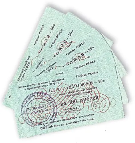В 1990 году советское руководство, действуя в условиях нарастающего товарного дефицита, решило мотивировать население к сдаче государству зерна, маслосемян, картофеля и овощей при помощи товарных чеков «Урожай-90». Чеки были выпущены в соответствии с постановлением Совета Министров РСФСР от 26 июля 1990 г. № 259 «О неотложных мерах по увеличению закупок сельскохозяйственной продукции урожая 1990 года и обеспечению её сохранности» и давали право их обладателям приобрести дефицитные в те времена товары – автомобили, холодильники, электронную технику. Люди с энтузиазмом начали сдавать сельхозпродукцию, но вскоре выяснилось, что товаров на всех не хватает, а потом и обещавшее товарное изобилие государство почило в бозе.