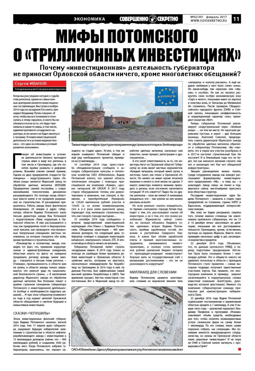 Губернатор Потомский любит строить «воздушные замки». В 2014 году только за полгода он наобещал более триллиона рублей инвестиций в Орловскую область! А «рабочие места», которыми он хвастался, окончательно ликвидировали бы безработицу на Орловщине (в 2016 году в ней, по данным Росстата, был зафиксирован самый высокий уровень безработицы в ЦФО). Тем временем процесс бегства инвесторов стал постоянным. Вот и Мценский завод по обработке цветных металлов, насколько нам известно, начал процесс регистрации в другом регионе