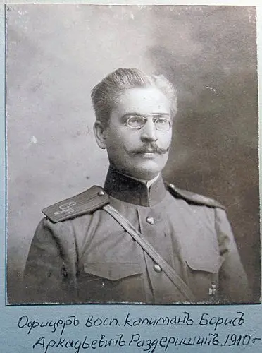 Основные вехи его биографии и служебный путь я проследил по его послужному списку и по спискам офицеров по старшинству: родился 16 (28) декабря 1872 года в семье штабс-капитана полевой конной артиллерии Аркадия Павловича Раздеришина. Учился сначала в Полоцком кадетском корпусе – как и два его старших брата, затем в Петербурге – во 2-м военном Константиновском училище (оба брата тоже учились там), закончив его по 1-му разряду. Служить начинал в 164-м пехотном Закатальском полку, но с 1898 года он уже служит в Отдельном корпусе пограничной стражи – в 25-й Черноморской пограничной бригаде, дислоцированной в Батуми. В 1903 году в чине штабс-ротмистра был переведён в Варшаву – офицером-воспитателем Суворовского кадетского корпуса. Спустя два года на его плечах – капитанские погоны, в 1910 году произведён в подполковники, награждён орденами: святого Станислава 3-й степени, святой Анны 3-й степени и святого Владимира 4-й степени. Старший брат Евгений – полковник лейб-гвардии, другой, Павел, армейский полковник, командир пехотного полка.
