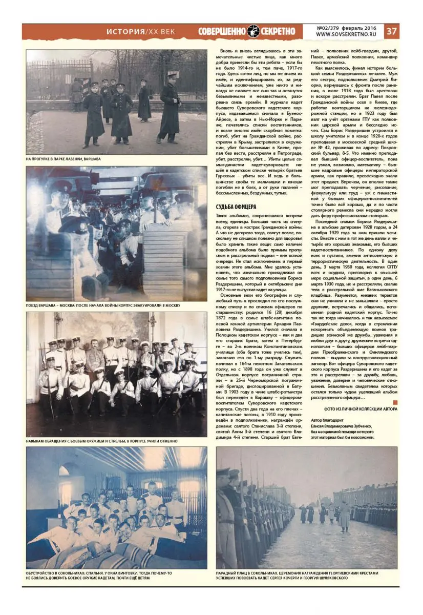 Последний снимок Бориса Раздеришина в альбоме датирован 1928 годом, а 24 октября 1929 года за ним пришли чекисты. Вместе с ним в тот же день взяли и четырёх его хороших знакомых, его бывших кадет-воспитанников. По одному делу всех и пустили, вменив антисоветскую и террористическую деятельность. В один день, 3 марта 1930 года, коллегия ОГПУ всех и осудила, приговорив к «высшей мере социальной защиты», в один день, 6 марта 1930 года, их и расстреляли, свалив тела в расстрельной яме Ваганьковского кладбища. Разумеется, никаких терактов они не учиняли и не замышляли – просто дружили, встречались и общались, вспоминая родной кадетский корпус. Точно так же тогда начиналось и так называемое «Гвардейское дело», когда в стремлении искоренить объединяющую воинов традицию воинской же дружбы, уважения и любви друг к другу, дружеские встречи однополчан – бывших офицеров лейб-гвардии Преображенского и Финляндского полков – выдали за контрреволюционный заговор. Вот офицера Суворовского кадетского корпуса Раздеришина и его кадет за это и расстреляли – за дружбу, любовь, уважение, доверие и человеческие отношения. Безмолвным свидетелем которых остался только чудом уцелевший альбом расстрелянного офицера…