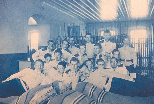 Только это был вовсе не дворец, щедро отданный под кадетский корпус, а вполне себе типовое для тогдашней России учебное заведение – тогда их именно так и строили, чтобы не унижать ни воспитанников, ни преподавателей. У каждой из четырёх рот – отдельное помещение: застеклённая прихожая, своя библиотека, своя уборная и умывальная комната, просторный и длинный коридор, огромная спальня – более сотни кроватей с тумбочками, ротный цейхгауз, запасный выход на случай пожара и везде большие краны с прикрученными шлангами. Неимоверных размеров столовая, где свободно помещались не только все кадетские роты и офицеры с преподавателями, но и множество приглашённых гостей. Гимнастический зал, где парадным маршем запросто проходил целый батальон с оркестром, просторные классные комнаты и специальные учебные кабинеты – физики, химии, столярная мастерская, музей, само собой – корпусная церковь, плацы, бани, паровое отопление, сложная система вентиляции, собственная электрическая станция, своя хлебопекарня…