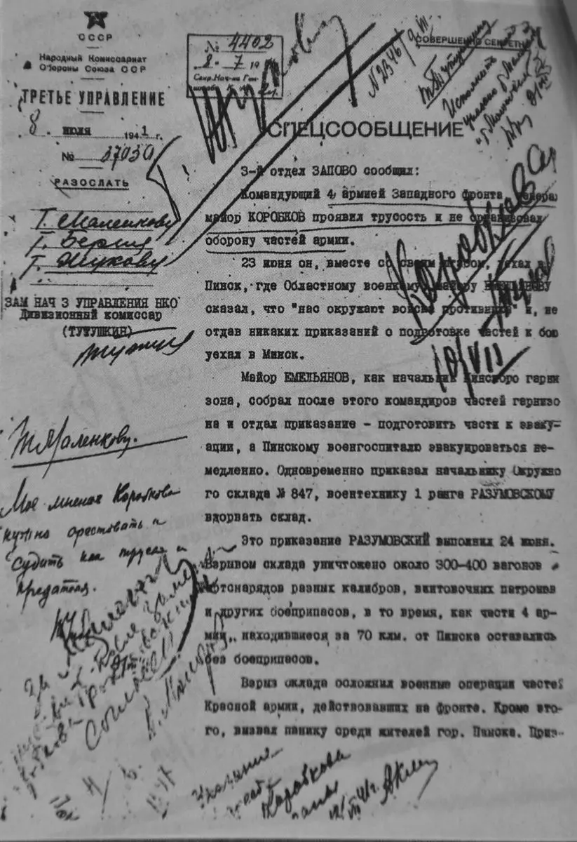 8 июля 1941 года начальник 4-го отдела 3-го Управления Наркомата обороны (до 3 февраля 1941 года – Особый отдел ГУГБ НКВД, а с 17 июля 1941 года – Управление особых отделов НКВД. – Прим. ред.) бригадный комиссар Болотин направил спецсообщение № 37030 двум членам Государственного комитета обороны (ГКО) – Георгию Маленкову и Лаврентию Берии, а также начальнику Генерального штаба РККА Георгию Жукову.