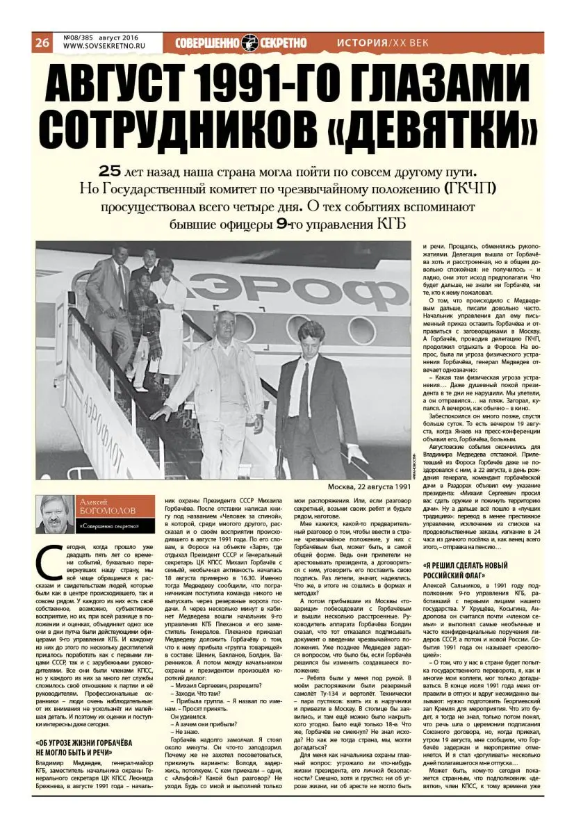 Сегодня, когда прошло уже двадцать пять лет со времени событий, буквально перевернувших нашу страну, мы всё чаще обращаемся к рассказам и свидетельствам людей, которые были как в центре происходившего, так и совсем рядом. У каждого из них есть своё собственное, возможно, субъективное восприятие, но их, при всей разнице в положении и оценках, объединяет одно: все они в дни путча были действующими офицерами 9-го управления КГБ. И каждому из них до этого по нескольку десятилетий пришлось поработать как с первыми лицами СССР, так и с зарубежными руководителями. Все они были членами КПСС, но у каждого из них за много лет службы сложилось своё отношение к партии и её руководителям. Профессиональные охранники – люди очень наблюдательные: от их внимания не ускользнёт ни малейшая деталь. И поэтому их оценки и поступки интересны даже сегодня.