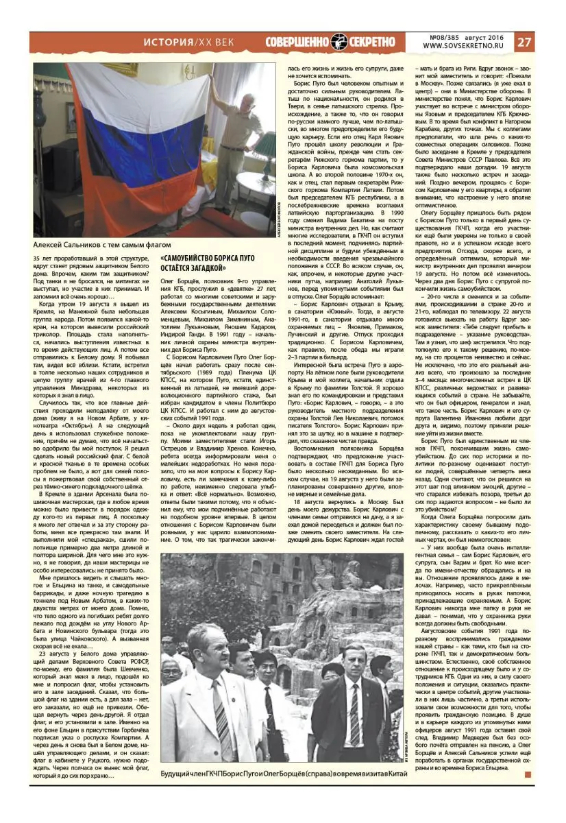 – 20-го числа я сменился и за событиями, происходившими в стране 20-го и 21-го, наблюдал по телевизору. 22 августа готовился выехать на работу. Вдруг звонок заместителя: «Тебе следует прибыть в подразделение – указание руководства». Там я узнал, что шеф застрелился. Что подтолкнуло его к такому решению, по-моему, на сто процентов неизвестно и сейчас. Не исключено, что это его реальный анализ всего, что произошло за последние 3–4 месяца: многочисленных встреч в ЦК КПСС, различных ведомствах и развивающихся событий в стране. Не забывайте, что он был офицером, генералом и знал, что такое честь. Борис Карлович и его супруга Валентина Ивановна любили друг друга и, видимо, поэтому приняли решение уйти из жизни вместе