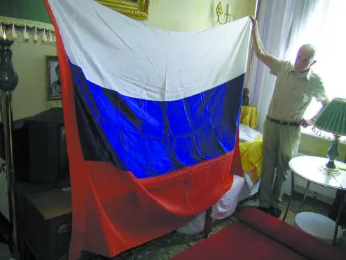Случилось так, что все главные действия проходили неподалёку от моего дома (живу я на Новом Арбате, у кинотеатра «Октябрь»). А на следующий день я использовал служебное положение, причём не думаю, что всё начальство одобрило бы мой поступок. Я решил сделать новый российский флаг. С белой и красной тканью в те времена особых проблем не было, а вот для синей полосы я пожертвовал свой собственный отрез тёмно-синего подкладочного шёлка.