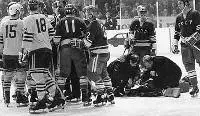 | Стокгольм, 1970 г. Чемпионат мира по хоккею. Тяжелую травму получил вратарь Виктор Коноваленко |