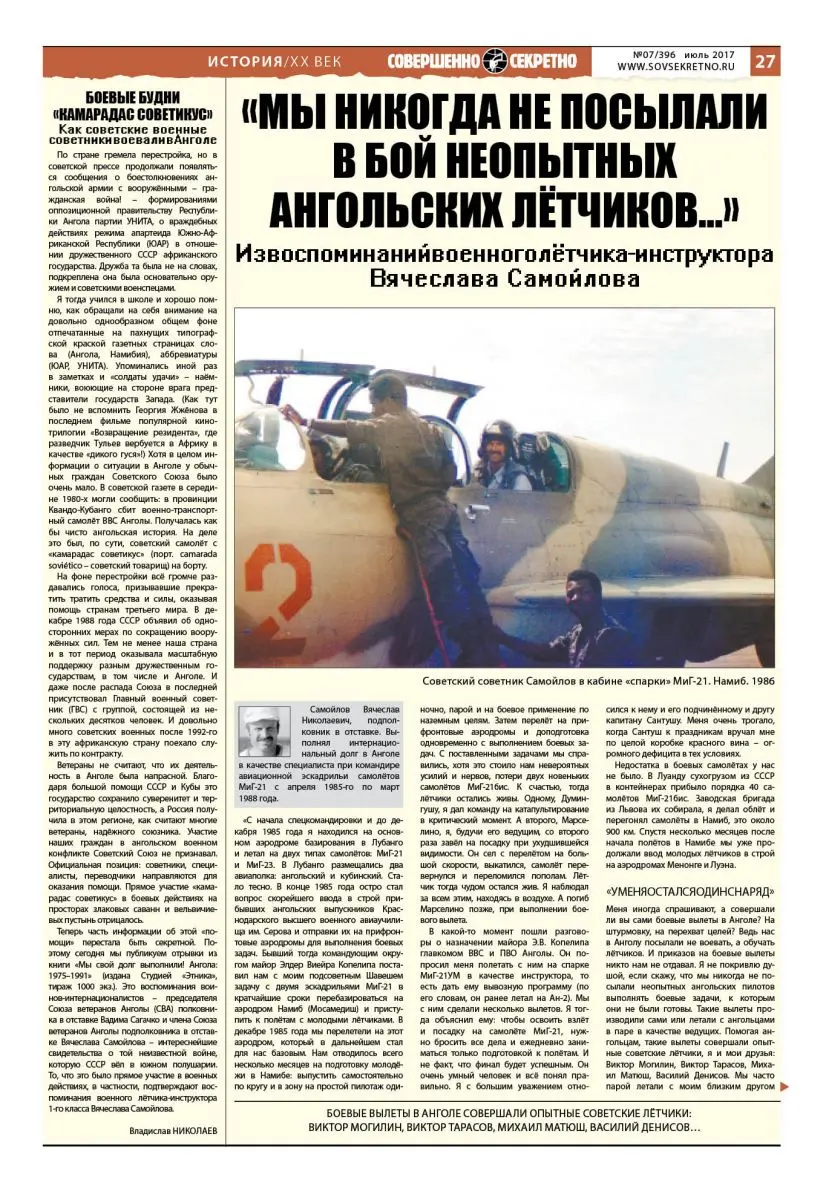 Теперь часть информации об этой «помощи» перестала быть секретной. Поэтому сегодня мы публикуем отрывки из книги «Мы свой долг выполнили! Ангола: 1975–1991» (издана Студией «Этника», тираж 1000 экз.). Это воспоминания воинов-интернационалистов – председателя Союза ветеранов Анголы (СВА) полковника в отставке Вадима Сагачко и члена Союза ветеранов Анголы подполковника в отставке Вячеслава Самойлова – интереснейшие свидетельства о той неизвестной войне, которую СССР вёл в южном полушарии. То, что это было прямое участие в военных действиях, в частности, подтверждают воспоминания военного лётчика-инструктора 1-го класса Вячеслава Самойлова.