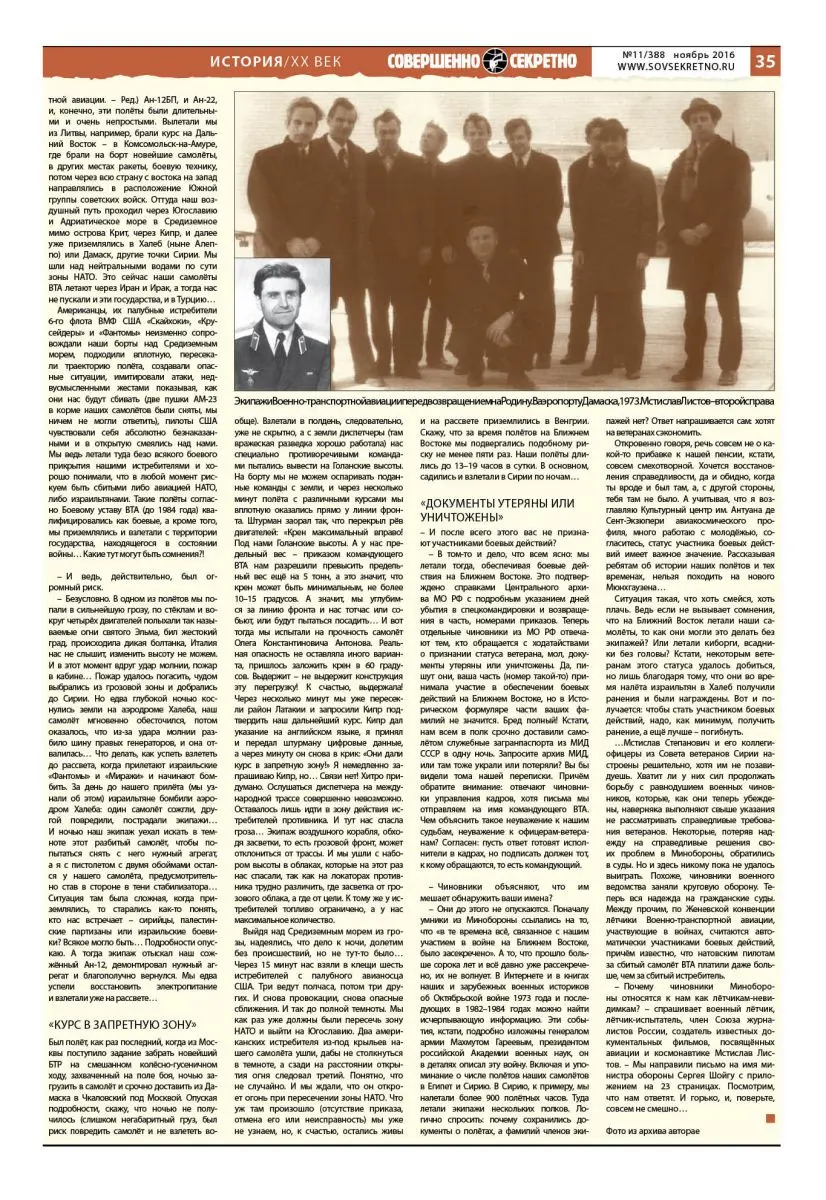 «Мы (те, кто не однажды обращался с заявлениями к командованию ВТА и Минобороны) считаем себя участниками боевых действий в Октябрьской войне 1973 года на Ближнем Востоке и имеем на то документальные доказательства, в том числе свидетельские. Но каждый раз сталкиваемся с бюрократической волокитой и приёмами, которые используют чиновники разных комиссий МО РФ, отказывающих нам в этом, что можно оценить только словами основателя СССР: «по форме правильно, а по существу издевательство». Считаем, что пора прекратить циничные отписки чиновников, командование ВТА должно ходатайствовать перед Минобороны РФ о справедливом решении данного вопроса. Надо думать, прежде всего, о людях, их благополучии и чувстве достоинства. Тем более что на сегодня нас осталось всего несколько сот человек. В любом случае, – завершает это письмо от имени своих боевых товарищей член Союза ветеранов Сирии, позже лётчик-испытатель, Мстислав Листов, – мы будем этого добиваться вплоть до обращения с открытым письмом в СМИ к Президенту России». С Мстиславом Листовым специально для газеты «Совершенно секретно» встретился и поговорил журналист Анатолий Журин.