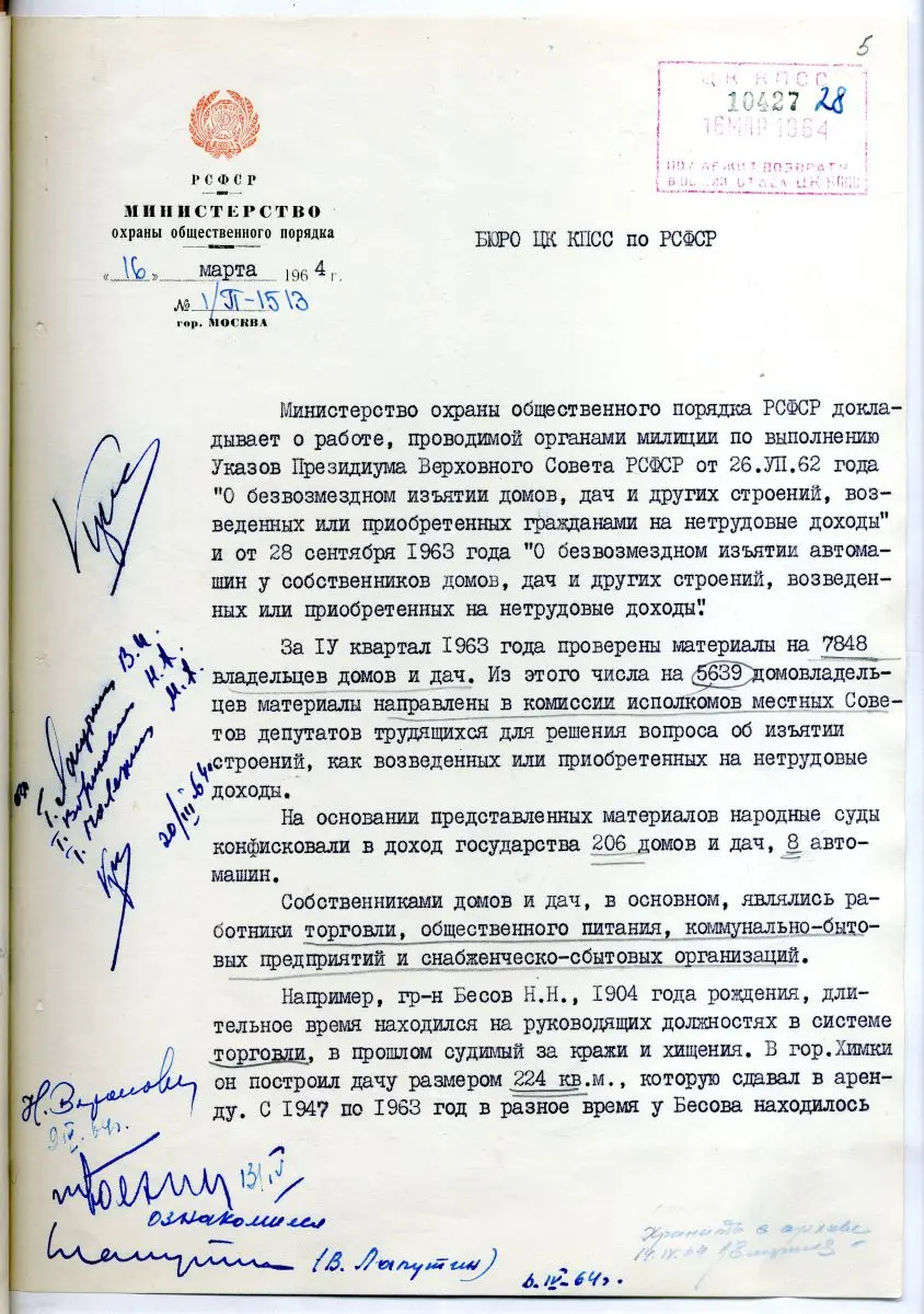 В письме Министерства охраны общественного порядка РСФСР в Бюро ЦК КПСС по РСФСР (это один из рассекреченных документов) отмечалось, что за IV квартал 1963 года только в этой союзной республике были проверены материалы на 7847 владельцев домов и дач. Из этого числа 5639 материалов было передано в комиссии исполкомов местных советов. Но реально конфисковывалось менее трех процентов домов и дач.