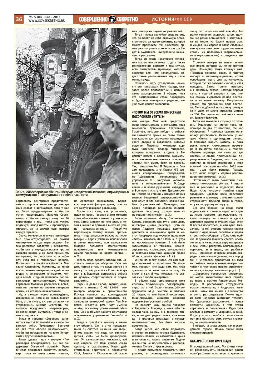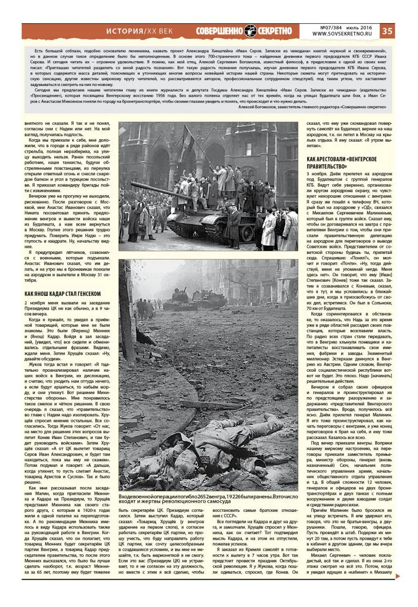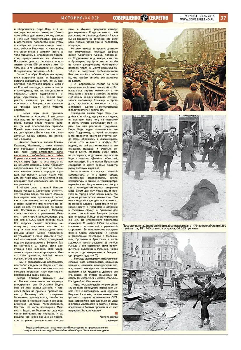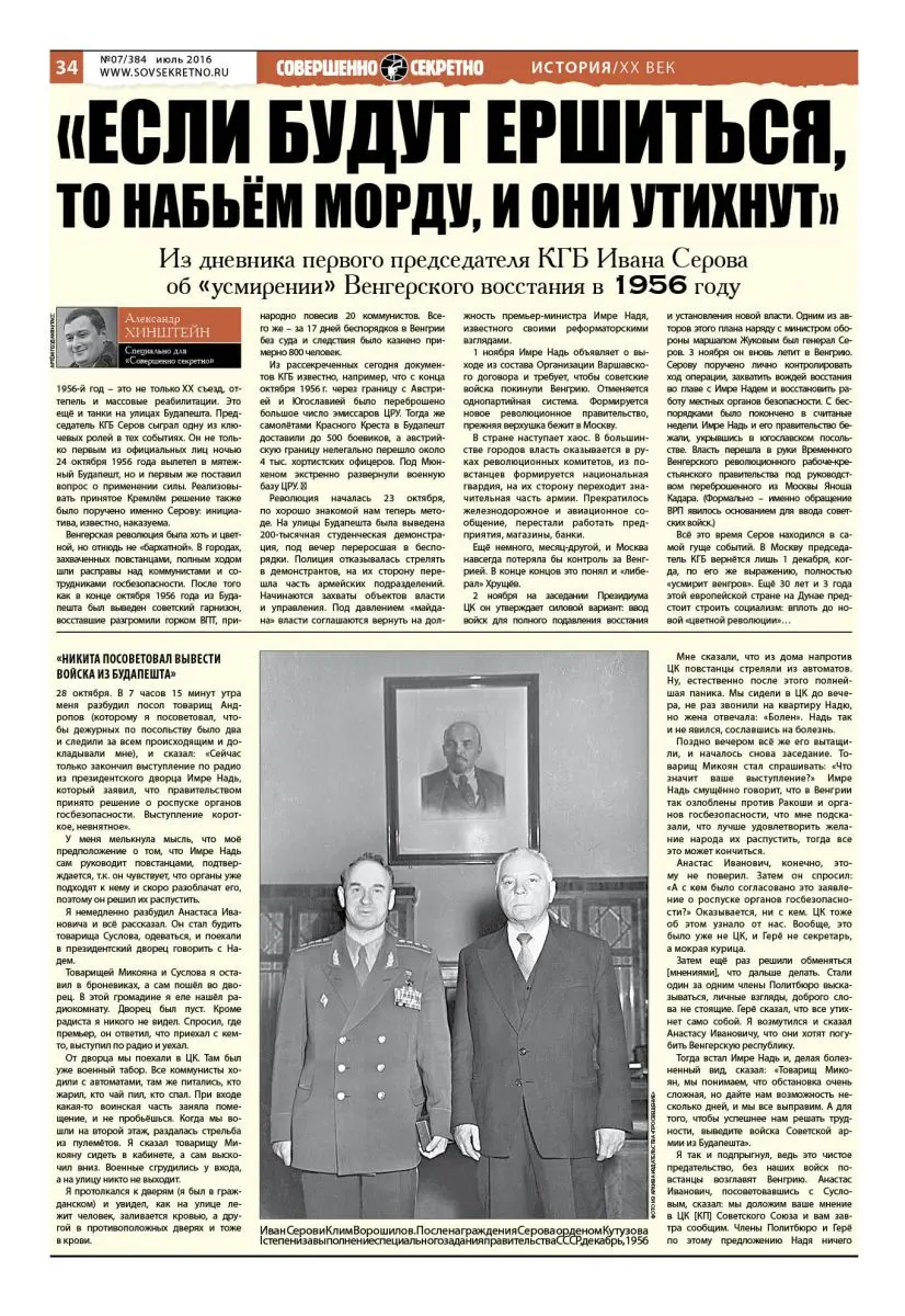 Всё это время Серов находился в самой гуще событий. В Москву председатель КГБ вернётся лишь 1 декабря, когда, по его же выражению, полностью «усмирит венгров». Ещё 30 лет и 3 года этой европейской стране на Дунае предстоит строить социализм: вплоть до новой «цветной революции»…