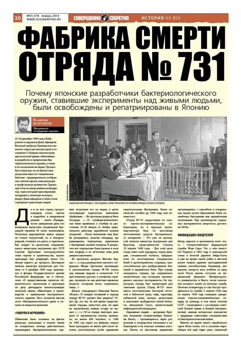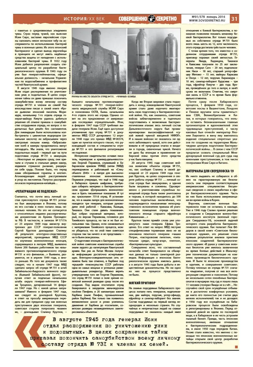 «Отряд № 731 представлял не только научно-экспериментальную лабораторию, но и крупную производственную базу по массовому изготовлению средств бактериального нападения. – Это уже из докладной записки министра внутренних дел Круглова, представленной Сталину 23 апреля 1949 года. – Для этой цели отряд имел свой аэродром, отряд авиации, специальный полигон, предприятия по изготовлению специальных бомб и артиллерийских снарядов, приспособленных для разбрасывания бактерий и заражённых блох. При отряде находилась тюрьма, где содержались заключённые, над которыми производились научные эксперименты. На территории отряда был крематорий для сжигания трупов. Отряд № 731 занимался изготовлением бактерий легочной и бубонной чумы, тифа, паратифа, сибирской язвы, холеры, дизентерии и изыскивал возбудителя новой болезни, именуемой Сонго, кровоточащей инфекционной лихорадки».