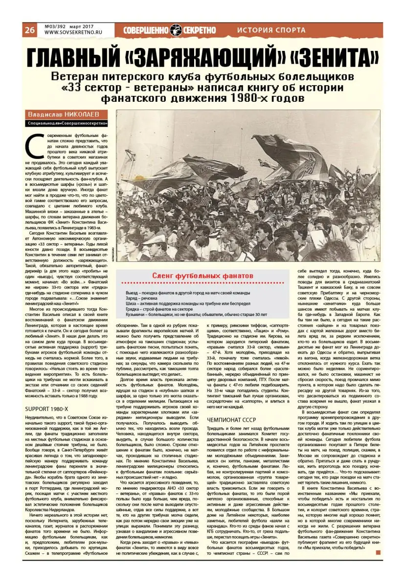 Многое из происходившего тогда Константин Васильев описал в своей книге воспоминаний о фанатском движении Ленинграда, которая в настоящее время готовится к печати. Он и сегодня болеет за любимый «Зенит». В наши дни делать это на самом деле куда проще. В восьмидесятые активная поддержка (support) трибунами игроков футбольной команды отнюдь не считалась нормой. Более того, в правилах поведения советского стадиона говорилось: «Нельзя стоять во время проведения мероприятия». То есть болельщики на трибунах не могли вскакивать в экстазе или отчаянии со своих сидений! Фанатский – 33-й – сектор получил возможность вставать только в 1988 году.