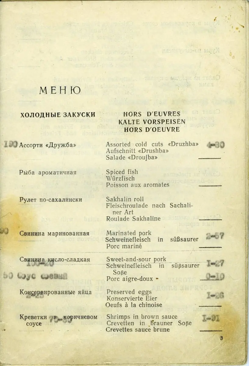 С конца семидесятых ассортимент экзотических блюд постоянно сокращался. У меня сохранилось меню за март 1983 года, в котором из 36 объявленных вторых горячих блюд гостям предлагалось лишь 13. А во времена перестройки ситуация вообще стала совсем другой.