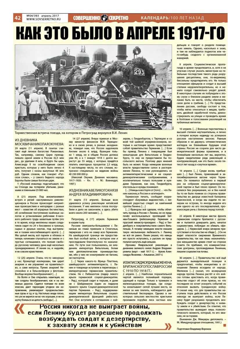 […] Через какого-то Фрица Платтена, швейцарского антимилитариста, г. Ленин и товарищи вступили в переговоры с императорским германским правительством. Не с Либкнехтом (лидер левого крыла германской социал-демократии. – Ред.), который сидит в тюрьме, и даже не с Шейдеманом (один из лидеров правого крыла Социал-демократической партии Германии. – Ред.), поддерживающим императора Вильгельма социал-демократической фракцией рейхстага. Нет. Они вступили в соглашение с кайзером, с Гинденбургом, с Тирпицем и со всей той шайкой аграриев-юнкеров, которые в настоящее время представляют собой правительство Германии. […] Если бы приезд Ленина с товарищами был невыгодным для Вильгельма и Гинденбурга, то ему не предоставили бы посольского вагона. Поэтому двух мнений быть не может. Когда немецкие военные власти предоставляли салон в распоряжение Ленина, то они руководились не антимилитаристическими и не социал-демократическими соображениями, а исключительно только пользами и нуждами Германии, как они, Гинденбурги, эти пользы и нужды понимают.