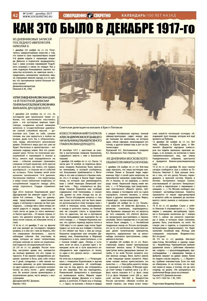 18 (5 по ст. ст.) декабря. Слухи о побеге Николая II опровергаются. <…> Перемирие с немцами, австрийцами, турками и болгарами заключено до 1 января 1918 г.; сейчас же начнутся переговоры о мире, в которых наши союзники, должно быть, участвовать не хотят. Не говоря уже о кадетах, и социалисты-революционеры предсказывают, что будет заключён похабный мир. Японцы уже совершили оккупацию Владивостока. Вот это дело!