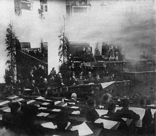 …Вся галерея (Таврического дворца. – Ред.) полна «приглашённых». Гости это особенные, пришедшие по пригласительным билетам большевистского коменданта. Всё большевистское дно здесь налицо. Рабочие, вооружённые кронштадтцы, вооружённые солдаты различных полков, с красными звёздами и также вооружённые красногвардейцы. Вся эта пёстрая толпа шумит, грохочет, слоняясь из буфета в буфет. …Нас встречает хохотом, диким свистом и руганью полупьяная галёрка. Так состоялось открытие Всероссийского Учредительного Собрания. …Шум, гам, наведённые винтовки. …Хохот, пьяный хохот господствует над всем …многие из гостей, большей частью матросы, спустились из верхних лож вниз, в зал заседаний. И бесцеремонно, точно это в порядке вещей, заняли депутатские места. Громко между собою переговариваются, шутят и нещадно курят