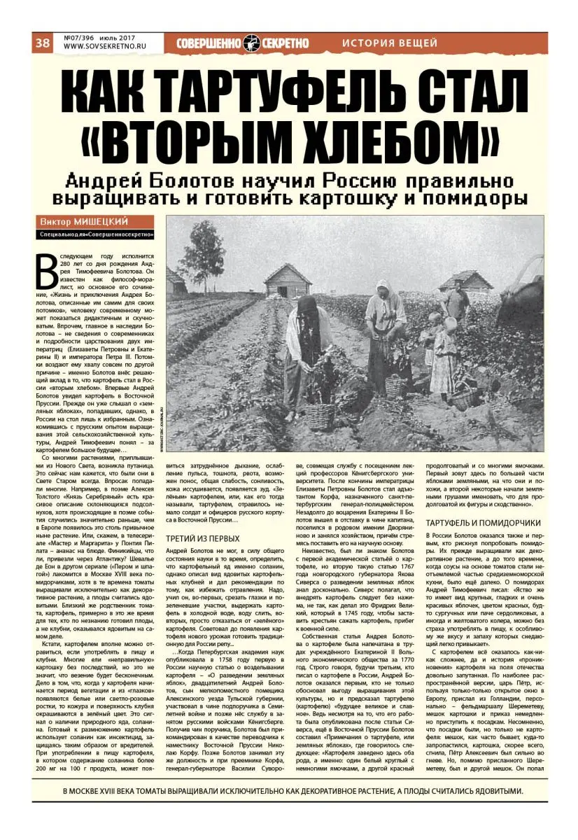 Собственная статья Андрея Болотова о картофеле была напечатана в трудах учреждённого Екатериной II Вольного экономического общества за 1770 год. Строго говоря, будучи третьим, кто писал о картофеле в России, Андрей Болотов оказался первым, кто не только обосновал выгоду выращивания этой культуры, но и предсказал тартуфелю (картофелю) «будущее великое и славное». Ведь несмотря на то, что его работа была опубликована после статьи Сиверса, ещё в Восточной Пруссии Болотов составил «Примечания о тартуфеле, или земляных яблоках», где говорилось следующее: «Картофеля заведено здесь оба рода, а именно: один белый круглый с немногими ямочками, а другой красный продолговатый и со многими ямочками. Первый зовут здесь по большей части яблоками земляными, на что они и похожи, а второй некоторые начали земляными грушами именовать, что для продолговатой их фигуры и сходственно».