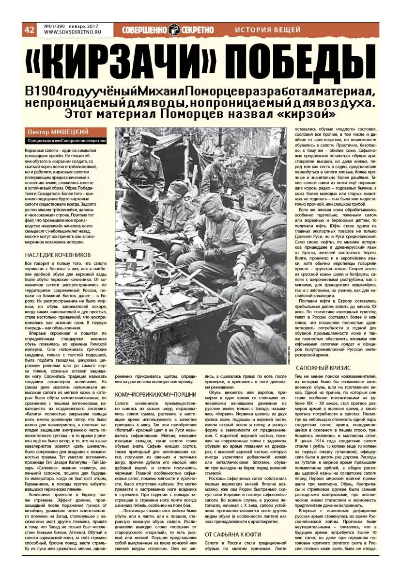 Кирзовые сапоги – один из символов прошедших времён. Не только облик обутого в «кирзачи» солдата, со скаткой через плечо и трёхлинейкой, но и работяги, кирзовым сапогом попирающим предназначенные к освоению земли, сложились вместе в устойчивый образ. Образ Победителя и Созидателя. Более того – возникло ощущение будто кирзовые сапоги существовали всегда. Задолго до появления трёхлинейки, целины и «всесоюзных» строек. Поэтому тот факт, что промышленное производство «кирзачей» началось всего семьдесят с небольшим лет назад, многие могут воспринять как злонамеренное искажение истории.