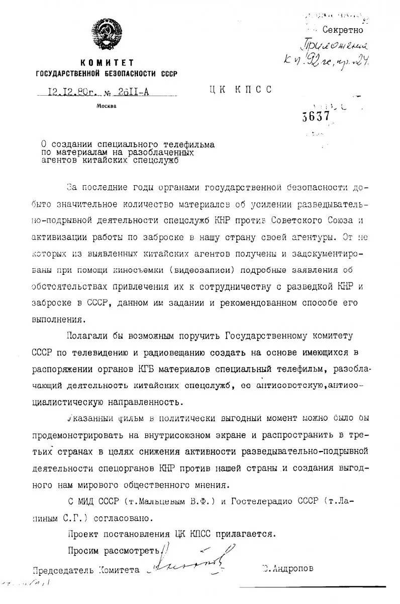 15 декабря 1980 года Секретариат ЦК КПСС принял закрытое постановление «О создании специального телефильма по материалам на разоблаченных агентов китайских спецслужб». Согласившись, как говорилось в документе, с доводами председателя КГБ СССР Юрия Андропова, изложенными в его служебной записке от 12 декабря 1980 года, Секретариат ЦК поручил Госкомитету СССР по телевидению и радиовещанию создать полнометражный документальный телефильм, «разоблачающий деятельность китайских спецслужб против СССР».