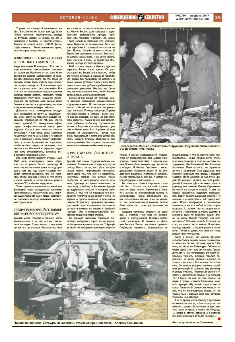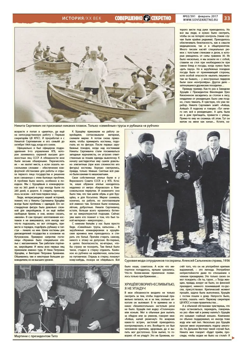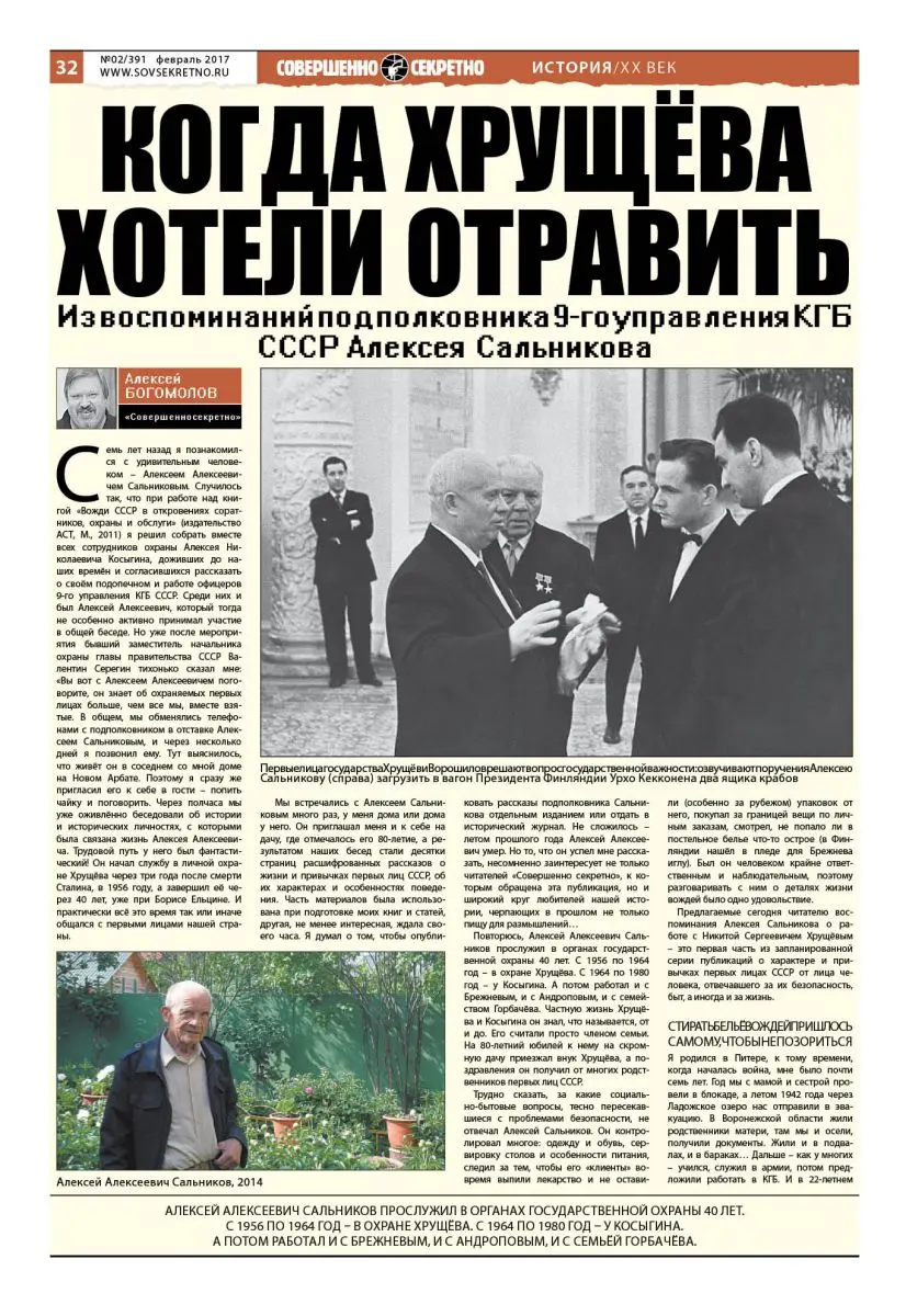 Семь лет назад я познакомился с удивительным человеком – Алексеем Алексеевичем Сальниковым. Случилось так, что при работе над книгой «Вожди СССР в откровениях соратников, охраны и обслуги» (издательство АСТ, М., 2011) я решил собрать вместе всех сотрудников охраны Алексея Николаевича Косыгина, доживших до наших времён и согласившихся рассказать о своём подопечном и работе офицеров 9-го управления КГБ СССР. Среди них и был Алексей Алексеевич, который тогда не особенно активно принимал участие в общей беседе. Но уже после мероприятия бывший заместитель начальника охраны главы правительства СССР Валентин Серегин тихонько сказал мне: «Вы вот с Алексеем Алексеевичем поговорите, он знает об охраняемых первых лицах больше, чем все мы, вместе взятые. В общем, мы обменялись телефонами с подполковником в отставке Алексеем Сальниковым, и через несколько дней я позвонил ему. Тут выяснилось, что живёт он в соседнем со мной доме на Новом Арбате. Поэтому я сразу же пригласил его к себе в гости – попить чайку и поговорить. Через полчаса мы уже оживлённо беседовали об истории и исторических личностях, с которыми была связана жизнь Алексея Алексеевича. Трудовой путь у него был фантастический! Он начал службу в личной охране Хрущёва через три года после смерти Сталина, в 1956 году, а завершил её через 40 лет, уже при Борисе Ельцине. И практически всё это время так или иначе общался с первыми лицами нашей страны.
