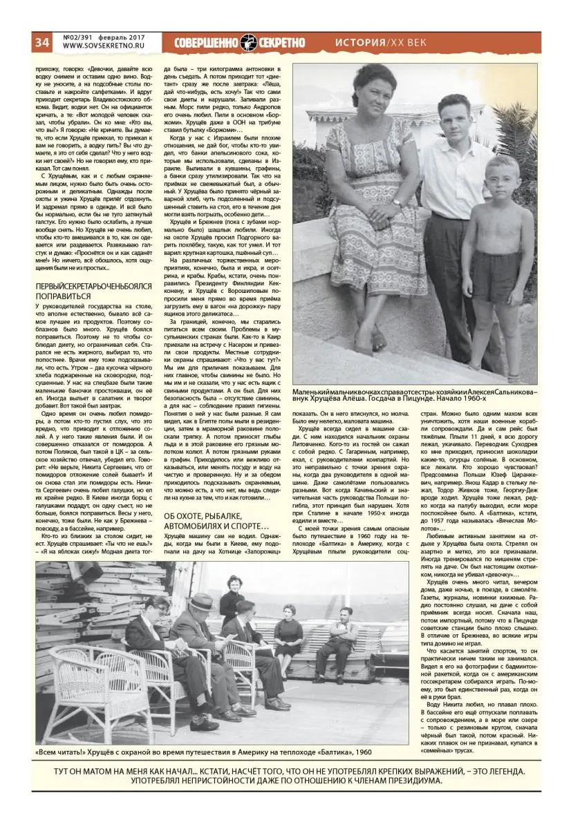 Повторюсь, Алексей Алексеевич Сальников прослужил в органах государственной охраны 40 лет. С 1956 по 1964 год – в охране Хрущёва. С 1964 по 1980 год – у Косыгина. А потом работал и с Брежневым, и с Андроповым, и с семейством Горбачёва. Частную жизнь Хрущёва и Косыгина он знал, что называется, от и до. Его считали просто членом семьи. На 80-летний юбилей к нему на скромную дачу приезжал внук Хрущёва, а поздравления он получил от многих родственников первых лиц СССР.
