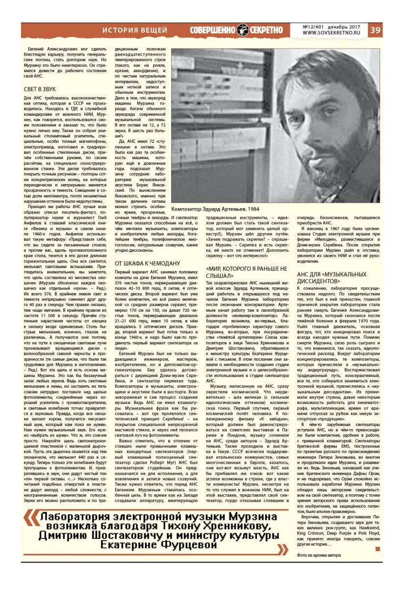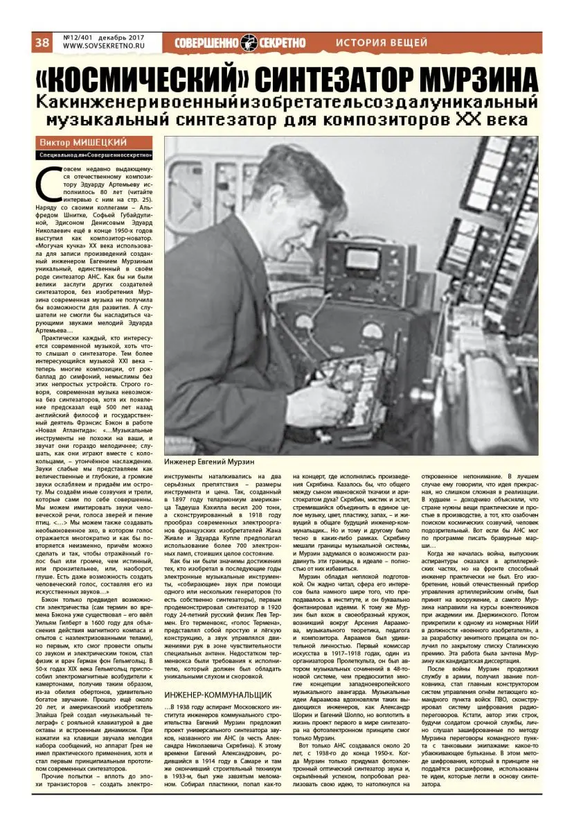 …В 1938 году аспирант Московского института инженеров коммунального строительства Евгений Мурзин предложил проект универсального синтезатора звуков, названного им АНС (в честь Александра Николаевича Скрябина). К этому времени Евгений Александрович, родившийся в 1914 году в Самаре и там же окончивший строительный техникум в 1933-м, был уже завзятым меломаном. Собирал пластинки, попал как-то на концерт, где исполнялись произведения Скрябина. Казалось бы, что общего между сыном ивановской ткачихи и аристократом духа? Скрябин, мистик и эстет, стремившийся объединить в единое целое музыку, цвет, пластику, запах, – и живущий в общаге будущий инженер-коммунальщик… Но и тому и другому было тесно в каких-либо рамках. Скрябину мешали границы музыкальной системы, и Мурзин задумался о возможности раздвинуть эти границы, в идеале – полностью от них избавиться