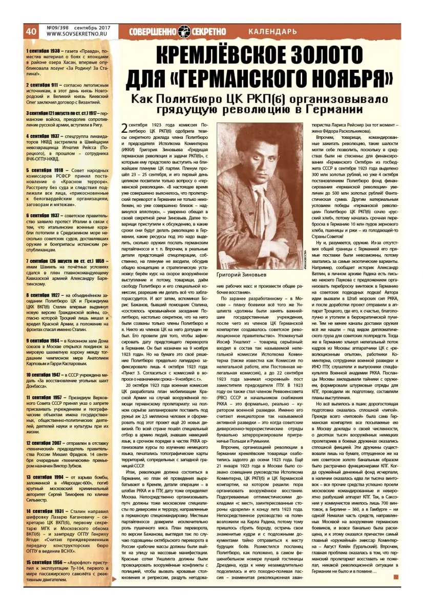 2 сентября 1923 года комиссия Политбюро ЦК РКП(б) одобрила тезисы секретного доклада члена Политбюро и председателя Исполкома Коминтерна (ИККИ) Григория Зиновьева «Грядущая германская революция и задачи РКП(б)», с которым ему предстояло выступить на ближайшем пленуме ЦК партии. Пленум прошёл 23 – 25 сентября, и его первый день целиком посвятили только вопросу о «германской революции». «В настоящее время уже совершенно выяснилось, что пролетарский переворот в Германии не только неизбежен, но уже совершенно близок – надвинулся вплотную», – уверенно обещал в своей секретной речи Зиновьев. Далее товарищи приступили к обсуждению, в какие сроки они будут делать революцию в Германии, какие ресурсы под это надо выделить, сколько оружия послать германским партайгеноссе и т. п. Впрочем, в реальные детали предстоящей спецоперации, собственно, на пленуме не входили, обсудив общую концепцию и стратегическую установку: берём курс на скорое вооружённое выступление и потому, товарищи, даём свободу Политбюро и его специальной комиссии, разрешив им делать всё что заблагорассудится. И вот затем, вспоминал Борис Бажанов, бывший помощник Сталина, «состоялось чрезвычайное заседание Политбюро, настолько секретное, что на него были созваны только члены Политбюро и я. Никто из членов ЦК на него допущен не был. Его провели для того, чтобы зафиксировать дату предстоящего переворота в Германии. Он был назначен на 9 ноября 1923 года». Но на бумаге это своё решение Политбюро предельно лапидарно зафиксировало лишь 4 октября 1923 года: «Пункт 3. Согласиться с комиссией в вопросе о назначении срока – 9 ноября с. г.».