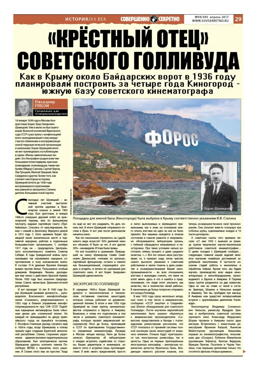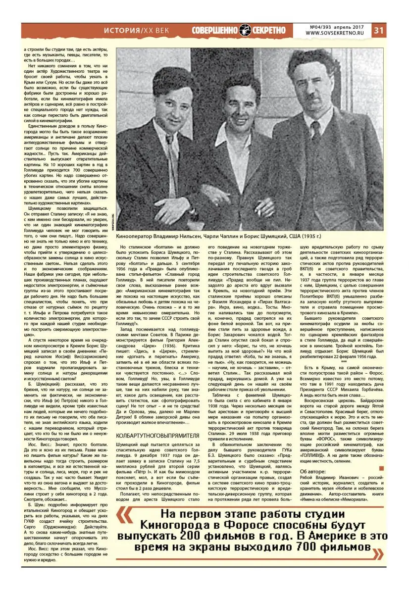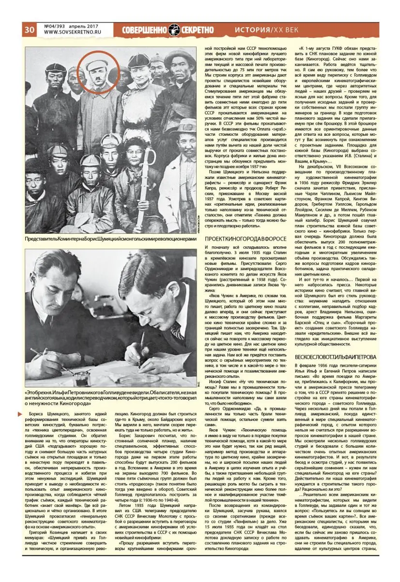 «К 1-му августа ГУКФ обязан представить в СНК плановое задание по южной базе (Киногород). Сейчас оно нами заканчивается. Работа ведётся тщательно. Я сам ею руковожу, тем более что всё время веду переписку с Голливудом и европейскими кинематографическими центрами, где через авторитетных людей – наших друзей – проверяем не ясные для нас вопросы. Кроме того, для получения исходных заданий и проверки собственных мы послали группу инженеров за границу. В ходе подготовок планового задания мы сделали прилагаемую при сём брошюру. В этой брошюре имеются все ориентировочные данные для ответа на все вопросы, которые могут у Вас возникнуть при ознакомлении с проектным заданием. Площадка для южной базы (Киногорода) выбрана соответственно указаниям И.В. [Сталина] и Вашим, в Крыму»…