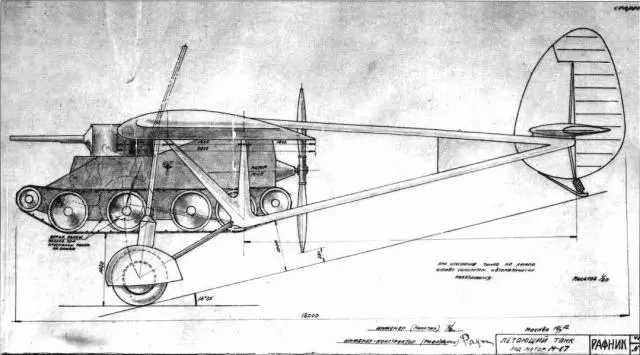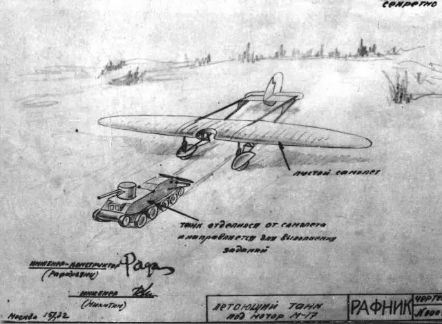 Одним из первых на призыв ведомства Ворошилова сконструировать «самолетающий танк» откликнулся Николай Камов (впоследствии – известный авиаконструктор, создатель вертолетов «Ка»), представивший проект танка-автожира. Свой прожект танка, уже с крыльями, предложили инженеры ЦАГИ П.Д. Самсонов и А.Л. Добровольский. Но военных поначалу больше всего привлекла разработка летающего танка конструктора Арама Рафаэлянца, тоже трудившегося в ЦАГИ. По замыслу Рафаэлянца, летающим следовало сделать танк БТ-2: его подвешивали под специальный планер-моноплан, с шасси которого он должен был взлетать и садился, а в кормовой части устанавливался воздушный винт. После посадки планера танк отсоединялся от него. «Выпав» из планера (с высоты 1,5 метра и с экипажем на борту), танк мог сразу устремиться в бой. Но это в теории и на чертежах, на практике же, когда все просчитали, то прослезились: стало ясно, что собственно для полета мощности двигателя, увы, никак не хватит. Но больше всего военных озаботило то, что танковые экипажи надо было составлять одновременно из танкистов и летчиков, а наготовить сразу столько танколетчиков было просто нереально. В общем, прожект так и не двинулся дальше чертежей