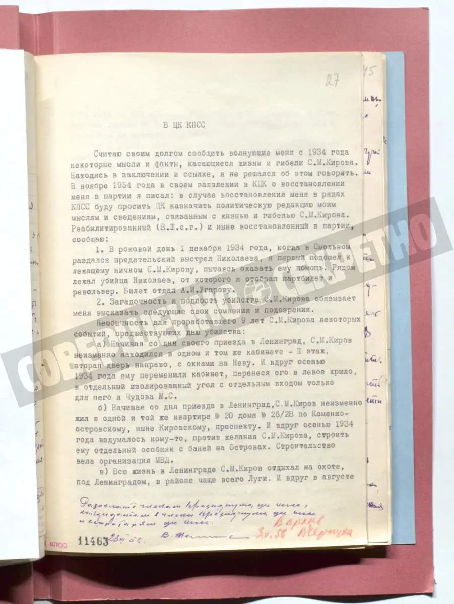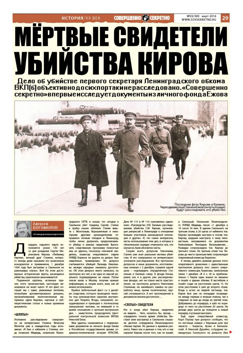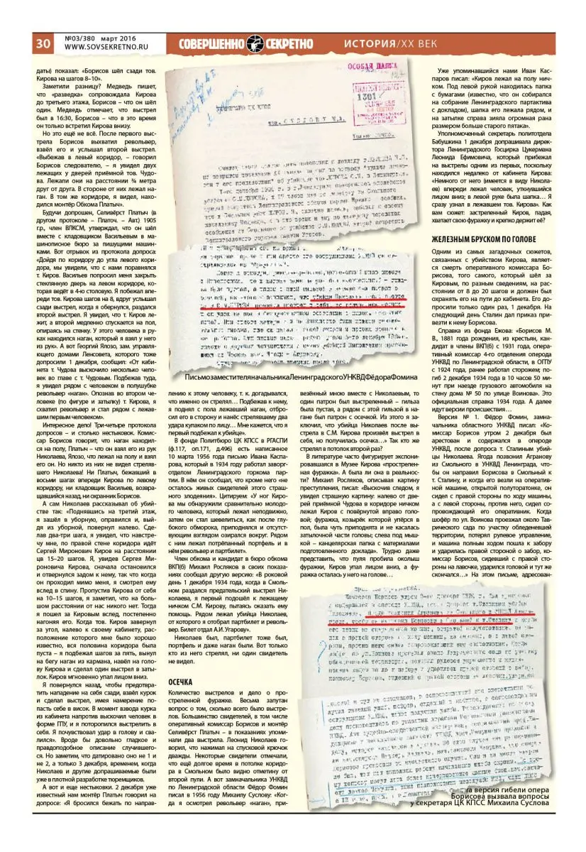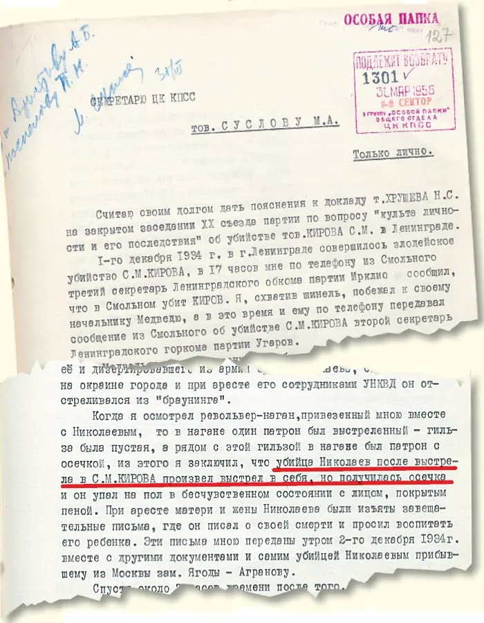 P.S. После ознакомления с архивными документами по убийству Кирова я пришёл к неутешительным выводам. В 1964 году была проведена ещё одна проверка обстоятельств убийства Кирова, но справка по результатам дополнительной проверки обстоятельств убийства С.М. Кирова от 1964 года до сих пор не обнаружена. Скорее всего, и она, и сотни других материалов до сих пор лежат в ведомственных архивах. Так что реальную картину этого загадочного события нашей истории можно будет воссоздать только при истребовании абсолютно всех имеющихся документов Генеральной прокуратурой с проведением профессионального следствия. Время для этого, как считают многие мои коллеги-историки, пришло уже давно…