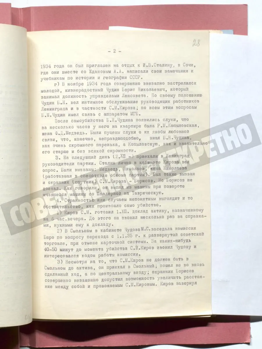 Чем была вызвана гипотетическая «неосторожность» Кирова, судить не нам, но, изучая архивные документы из фонда Политбюро ЦК КПСС, я наткнулся на весьма странную фразу члена Ленинградского обкома и кандидата в члены бюро обкома Михаила Рослякова «В ноябре 1934 года совершенно внезапно застрелился молодой, жизнерадостный Чудин Борис Николаевич, который занимал должность управделами Ленсовета. По своему положению Чудин Б.Н. вёл интимное обслуживание руководящих работников Ленинграда, и в частности С.М. Кирова».