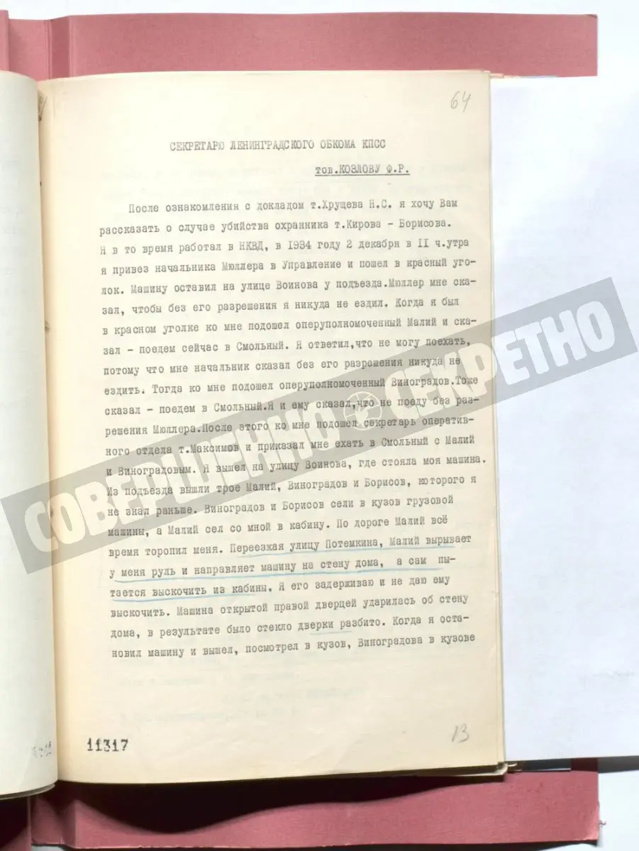 Кстати, водитель Василий Кузин в письме на имя того же Фрола Козлова в 1956 году описывает обстоятельства прибытия к зданию УНКВД и убийства Борисова несколько по-другому: «2 декабря в 11 ч утра я привёз начальника Мюллера в управление и пошёл в красный уголок (помните показания Кузина на следствии 1937 года о том, что его вызвали в 5–6 утра? – Авт.). Машину я оставил на улице Воинова у подъезда». Затем Кузина несколько раз просили выехать в Смольный, но, поскольку Мюллер строго-настрого приказал никуда не уезжать, то поехал он только по приказу секретаря оперативного отдела Максимова.