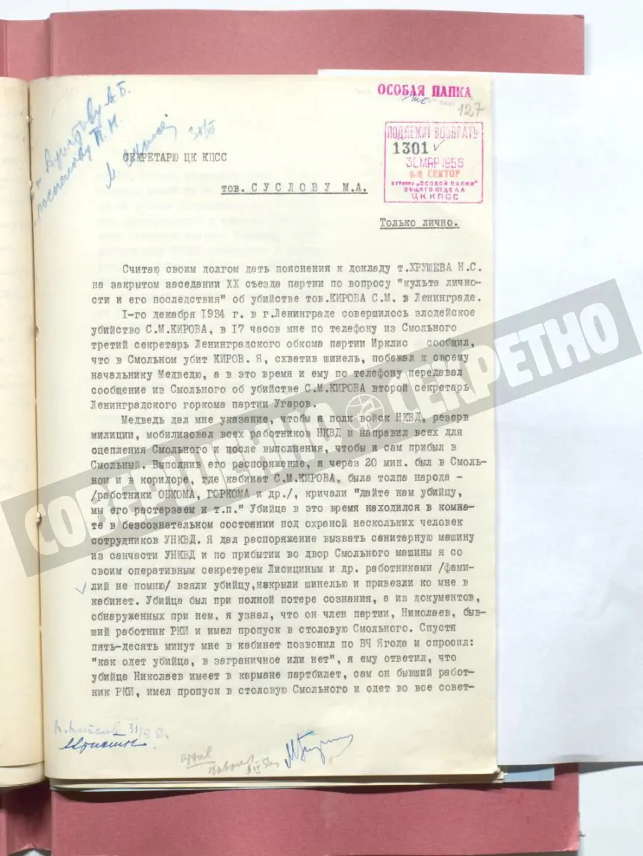 А вот о втором допросе Мильды Драуле неизвестно практически ничего! Нам удалось выяснить, что вопреки распространенному мнению, Сталин вызывал на допрос 2 декабря не только начальника Ленинградского управления НКВД Медведя, Николаева, оперативника Борисова, но и жену Николаева Мильду Драуле. Об этом в ЦК КПСС писал Михаил Росляков, в 1934 году член Ленинградского обкома и кандидат в бюро обкома ВКП (б). При этом он утверждал, что Драуле «работала в спецотделе обкома партии». Но никакого отражения в архивных документах этот допрос пока не нашёл. Видимо, было, что скрывать…