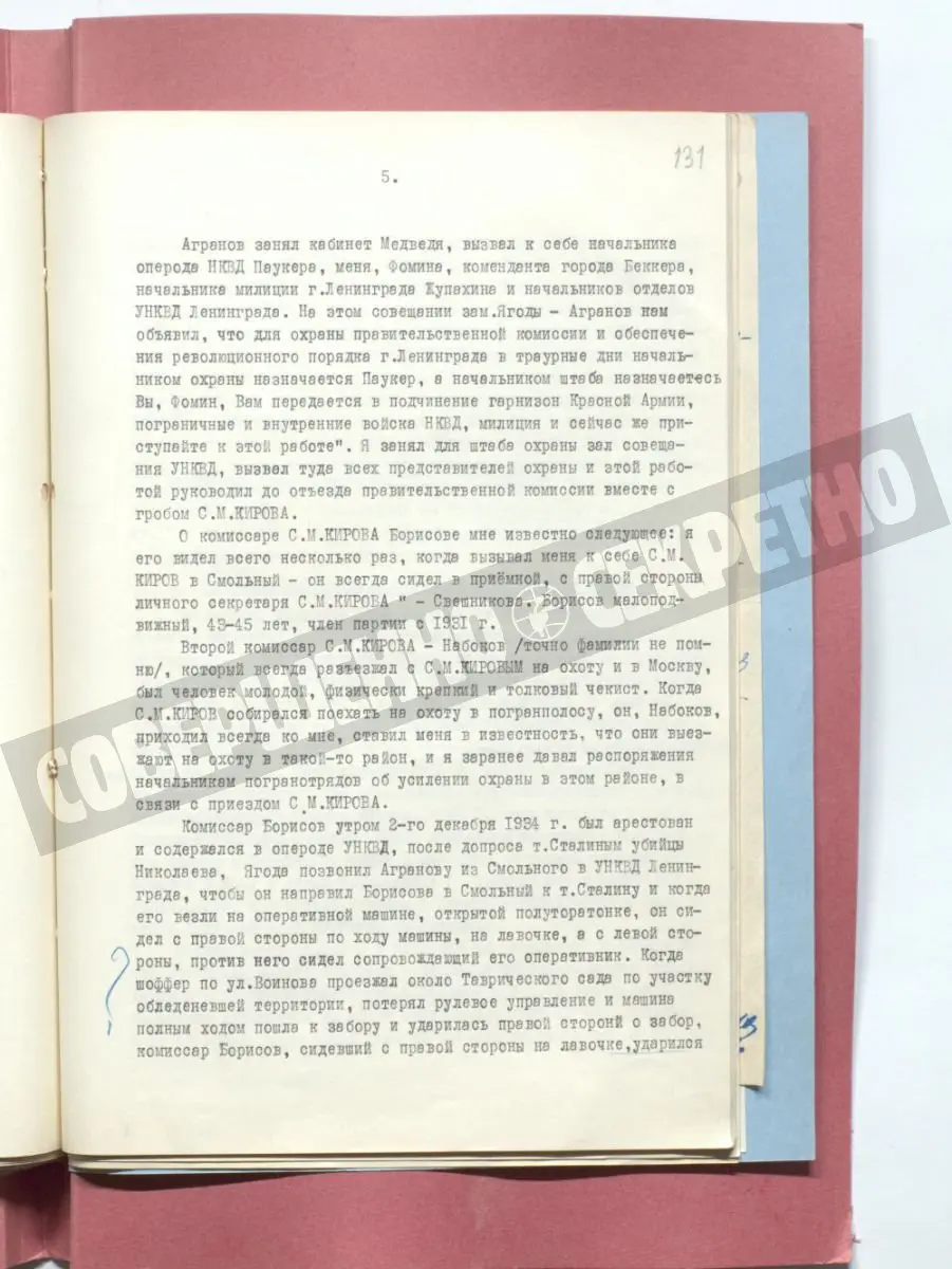 А теперь давайте сравним данные этого оперативного донесения с единственным протоколом допроса того самого оперативного комиссара Борисова, написанным также 1 декабря: «В 4 ч. 30 м. приблизительно т. Киров один вышел из машины и пошёл в здание обкома. В вестибюле я пошёл сзади на расстоянии шагов 15. На этом расстоянии я шёл до второго этажа. Когда я встал на первой лестнице, тов. Киров был уже на площадке посередине между первым и вторым этажом, так я следовал за ним до входа на третий этаж. Добравшись до коридора, я шёл по коридору от него на расстоянии 20 шагов. Не доходя двух шагов до поворота в левый коридор, я услышал выстрел».