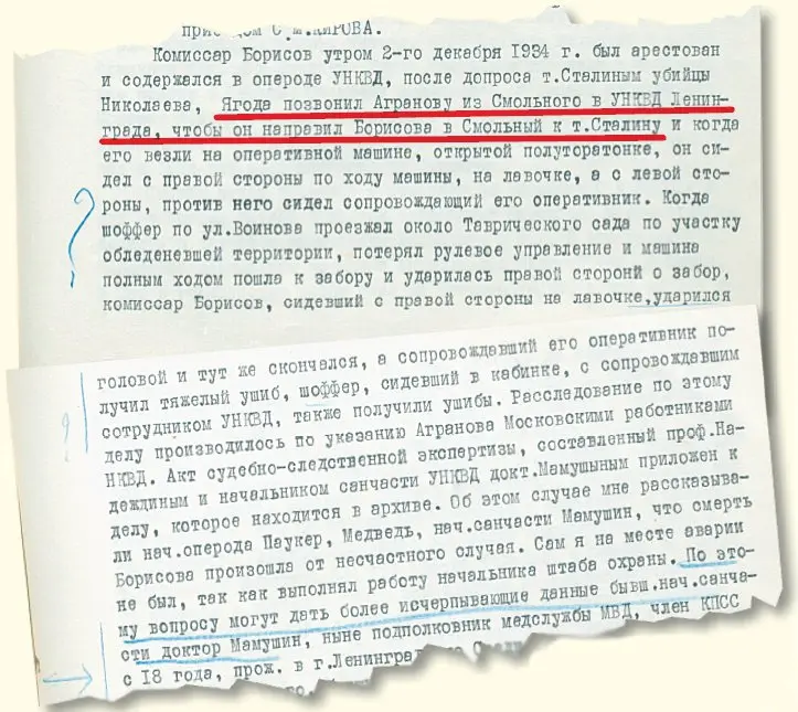 Справка из фонда Ежова: «Борисов М. В., 1881 года рождения, из крестьян, кандидат в члены ВКП(б) с 1931 года, оперативный комиссар 4-го отделения оперода УНКВД по Ленинградской области, в ОГПУ с 1924 года, ранее работал сторожем; погиб 2 декабря 1934 года в 10 часов 50 минут при наезде грузового автомобиля на стену дома № 50 по улице Воинова». Это официальная справка 1934 года. А далее идут версии происшествия…