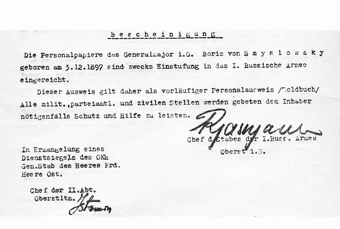 4 апреля 1945 года, после непростых и длительных переговоров в германском генштабе, Смысловский получил приказ о создании так называемой 1-й Русской национальной армии (формально – «части особого назначения 1-й восточной группы фронтовой разведки Генерального штаба сухопутных сил вермахта (ОКХ), а сам получил чин генерал-майора и был утвержден командиром этого формирования.