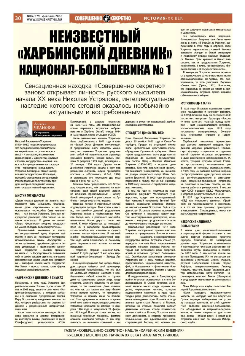 Сенсационная находка «Совершенно секретно» заново открывает личность русского мыслителя начала XX века Николая Устрялова, интеллектуальное наследие которого сегодня оказалось необычайно актуальным и востребованным